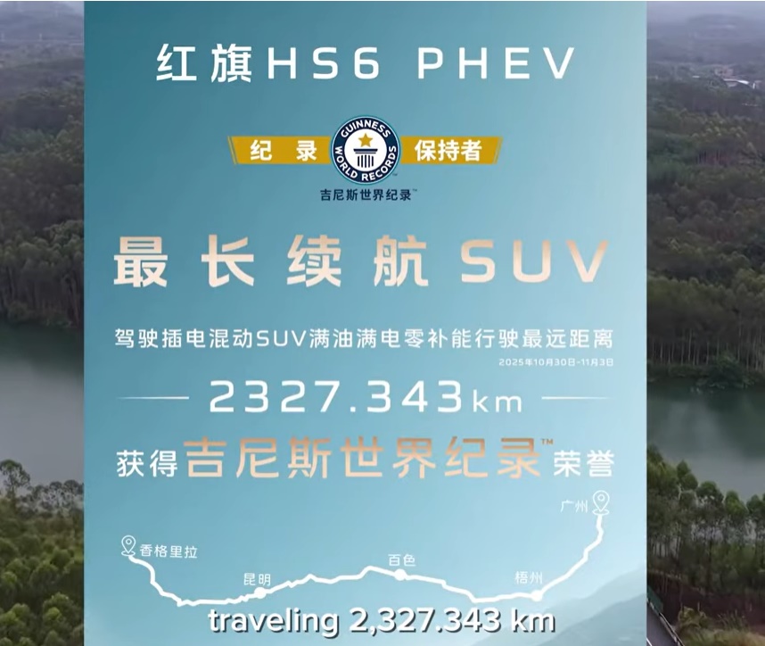 Ķīnas luksas automobiļu ražotāja Hongqi modelis HS6 PHEV ir uzstādījis jaunu Ginesa rekordu kategorijā “Garākais brauciens ar sērijveida uzlādējamu hibrīda SUV bez uzpildes vai uzlādes”.
