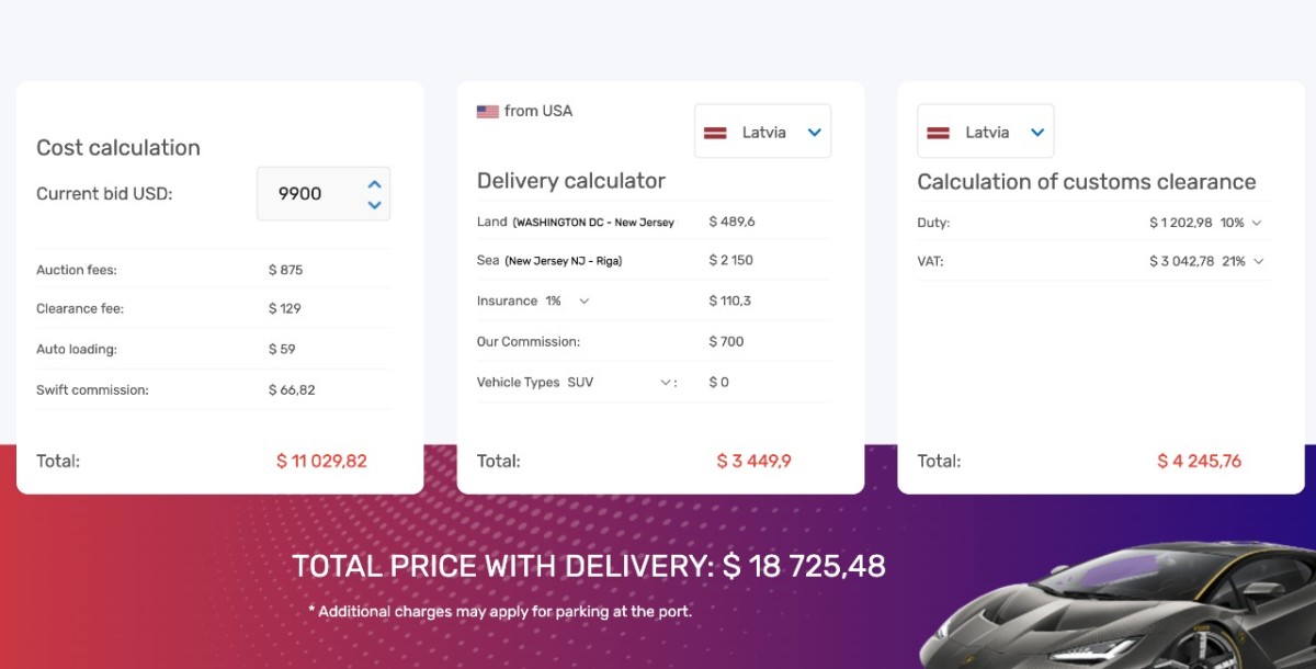 Kalkulators sniedz precīzu aprēķinu un ļauj izvairīties no pārsteigumiem. Pircējs jau iepriekš redz reālo summu ar visām izmaksām, sākot no izsoles cenas līdz muitošanai Latvijā.