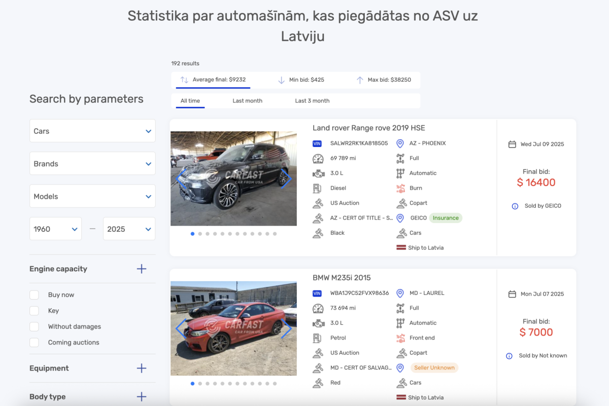 ● tādi servisi kā Carfast Express uzrāda vidējās likmes pēc markas, modeļa un stāvokļa, ļaujot objektīvi novērtēt reālo auto vērtību (ASV izsoļu statistikas rīks);