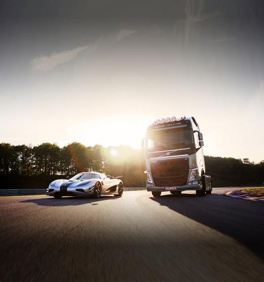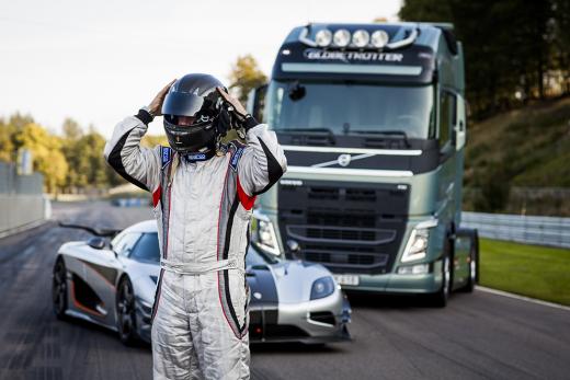 Tāds ir jaunās Volvo īsfilmas “Volvo Trucks pret Koenigsegg” scenārijs. Sacīkšu mērķis ir vēlreiz pārbaudīt jauno I-Shift divsajūgu pārnesumkārbu, kura izstrādāta, pamatojoties uz sporta automašīnās izmantoto tehnoloģiju.