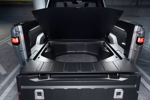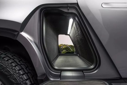 Pikapa unikālākā atšķirība ir šķērsām iebūvēts bagāžas nodalījums (skat. attēlu) ar 330 litru ietilpību, kas pieejams no abām pusēm, savukārt otrs bagāžas nodalījums atrodas tur, kur vairumam automobiļu ir motors. Vēl viens prāvs mantu nodalījums, kas piesegts ar vāku, atrodas zem pikapa kravas kastes grīdas.  R1T apveltīts ar 800 kg kravnesību un drīkst vilkt līdz pat 3500 kg smagu piekabi vai treileri.