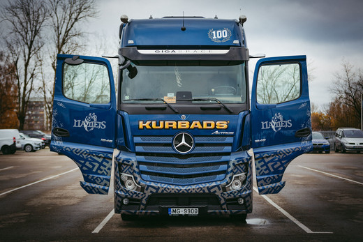 ”. Ievērojot uzņēmuma vēsturiskās tradīcijas, arī simto “Kurbads” autovedēja dizainu izstrādājis latviešu mākslinieks Alfrēds Paulausks, savukārt zīmīgā simtā Mercedes-Benz Actros virsbūvi rotā seno zemgaļu virsaitis Namejs.