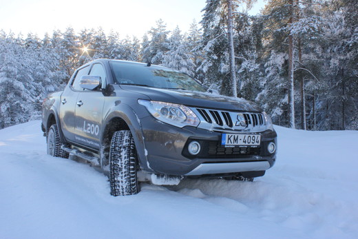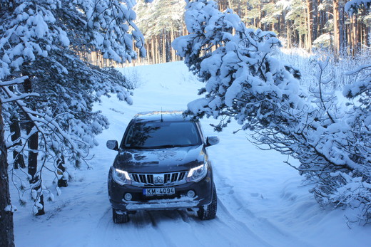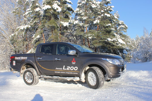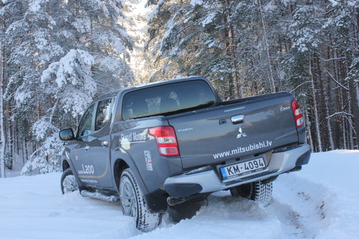 Auto izskatam vienmēr ir nozīme, bet pikapiem daudz svarīgakas ir to gaitas un vadāmības īpašības. Pilsētas burzma un nebeidzamie krustojumi nav īstā vieta, kur novērtēt pikapa dotumus, tāpēc raujos ārā no pilsētas uz sev zināmiem bezceļa laukiem. Uz šosejas sajūtas labas. L 200 ripo pārliecinoši, labi tur ceļu, ar vadību nav nekādu problēmu. Spēkratam ir samērā laba skaņas izolācija, un uz laba asfalta tu jūties kā vidējās klases sedanā. Pateicoties atsaucīgajam 2,4 litru turbo dīzelim(līdz 430 Nm), L200 viegli paātrinās un apdzīšanu var veikt bez īpašas "sagatavošanās". Straujāk palielinot apgriezienus, dzinēja troksnis dzirdams arī salonā, taču troksnis nav pastāvīgs un pārāk nomācošs. Beidzoties gludajam asfaltam, beidzas arī līganā gaita. Pikaps paliek pikaps. Spēkratam nepatīk sīki nelīdzenumi, vilnīši un asfalta ielāpi. Par to visai ātri uzzina braucēji īpaši aizmugurējā rindā sēdošie. Te liela loma atsperojumam, īpaši aizmugurējam. Tas paredzēts kravu vešanai un braukšanai pa sliktiem un ļoti sliktiem ceļiem. Tāpēc ražotājam pārmest negribas. Pieņemam lietas kādas tās ir un dodamies bezceļa meklējumos. Turpceļa vēl izbaudu efektīgās bremzes, kuras ir gana informatīvas, ļauj viegli adaptēties pie pedāļa darbības. Jāuzteic arī ABS darbība. Tā ir pietiekami "inteliģenta" un dod pārliecību, ka auto varēs arī uz slidena ceļa apturēt. Beidzot esmu nobraukuši no šosejas un dodamies meža klajuma virzienā, kur zem augstsprieguma līnijas Latvenergo vīri veiksmīgi tikuši galā ar visu, kam vēlme dzīt saknes un tiekties pretī saulei. Irdenu smilts stigu klāj pabieza(ap 20 cm) tikpat irdena sniega kārta. Aktivizēju 4x4 un uz priekšu, ar domu redzēs kā ies. Pateicoties atbilstošām ziemas riepām un auto klirensam, auto brauca bez "stostīšanās". Brīžiem dziļākās bedrēs pat stuma sniegu pa priekšu, bet neapstājās. Pikaps jutās kā savā ādā. Sarežģījot apstākļus, speciāli apstājos slīpumā un L200 sāka rakties, taču tiklīdz nobloķēju starpasu diferenciāli, auto izrāpās no špūres un bijām uzkalnā. Sapratu, ka Latvijas ikdienas bezceļš šim spēkratam ir pa plecam, jo es vēl neizmantoju pēdējo opciju - pilnpiedziņa ar pazemināto pārnesumu, sabloķētiem aizmugurējā tilta un starpasu diferenciāļiem. Skaidrs, ka norakt var jebkuru braucamo, bet vai tā ir mūsu ikdiena. Šāds auto tevi nepievils, ja pats to neuzsēdināsi uz "vēdera". Pa brīdim pasekojot degvielas patēriņam sapratu, ka pie dažādiem ceļa apstākļiem vidējais patēriņš varētu būt ap 10l/100km. Atpakaļceļā izmēģināju slēgt pārnesumus ar roku(konkrētais auto bija ar AT). Lāpstiņas pie stūres darbojas nevainojami, bet cik tas ir lietderīgi šādam auto, tas ir cits jautājums.