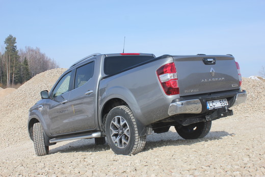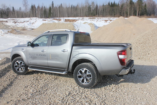 Ērti sēžam pie stūres un laižam pa šoseju. Skaisti. Alaskan ripo pārliecinoši, nav problēmu ne ar vadību, ne ar dinamiku. Apdzīšanai nav īpaši "jānobriest". Ceļš brīvs, laid garām fūrei. Manevrs ir drošs(patīkami), par to parūpējas 2,3 litru turbo dīzelītis ar 450Nm jau sākot no 1500 apgr. Dzinējs spēj nodrošināt labu dinamiku 2 tonnu smagajam pikapam. Braucot dinamiski, mazliet pa mežu, smiltīm un lauku ceļiem, degvielas patēriņš svārstās starp 10-11 l/110km. Savukārt starppilsētu maršrutā(bet satiksmē) dators uzrādīja ap 7,5l/100km. Sakarīgi cipari divtonnīgam auto. Iespējams iebrauktam auto šie skaitļi pamainīsies ekonomijas virzienā. Labs "pārinieks" franču dīzelītim ir 7 pakāpju automāts. Pārslēgšanās notiek ilgi nedomājot un bez rāvieniem. "Drive" automātiskajā režīmā pārnesumu kārba it kā pielāgojas braukšanas stilam. Aktīvi gāzējot, tiek pieturēts zemāks pārnesums, tā nodrošinot augstākus apgriezienus, nepieciešamus dinamiskākam braucienam. Tas liek justies pie stūres pārliecinošāk. Ja gribas ieekonomēt, var pāriet uz manuālo režīmu un ātrāk mainīt pārnesumus. Tādā veida lieki neturot dzinēju augstos apgriezienos, kā tas ir braucot "drive" automātiskajā režimā.