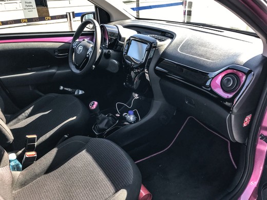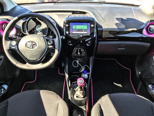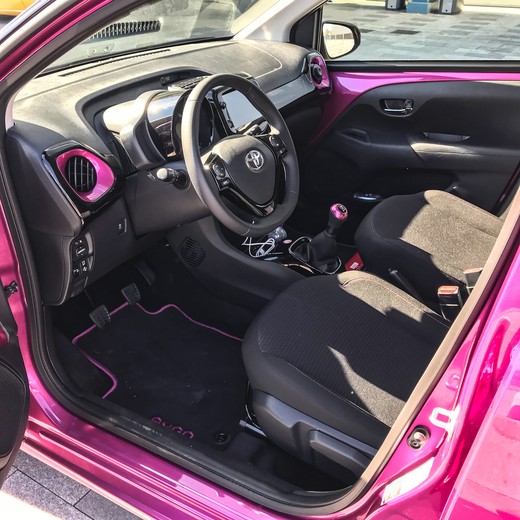 Vadītāja vieta kopumā ir ergonomiska. Nākas uzteikt Aygo multimediju sistēmu, kuras saskarne šķiet vispievilcīgākā un ērtāk lietojamā Toyota aktuālo modeļu klāstā. Te gan nav pieejama iebūvētā navigācija, taču tiek piedāvāts savienojums ar Android un iPhone tālruņiem. Klimata nodrošināšanai lētākajā variantā būs mehāniskie slēdži, kur temperatūras un ventilācijas plūsmas ātruma uzstādīšanai mehāniskie slēdži ir izvietoti sākotnēji grūti uztverami. Automātiskā klimata kontrole ir intuitīvāka un pieejama dārgākās komplektācijās. Centrālā paneļa abās pusēs novietotas lielākas pogas – dzinēja iedarbināšanai un avārijas gaismām. Iespēja gan maza, bet pastāv maza varbūtība, ka kādam, steigā cenšoties parādīt ‘paldies’ aizmugurē braucošajam, sajūk un nospiežas dzinēja poga.