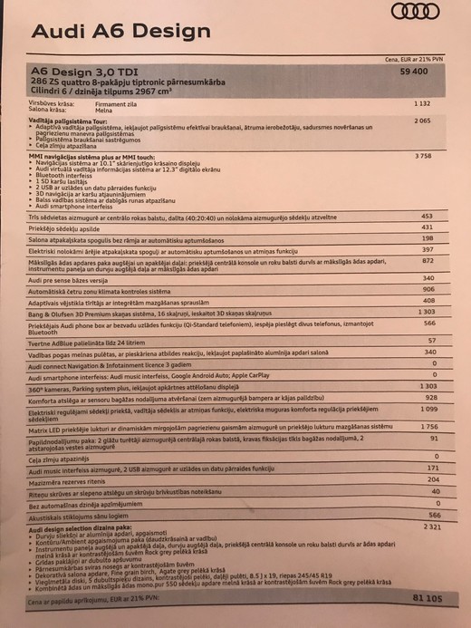 Izmēģinātais auto bija Audi A6 Design ar 50 TDI jeb 286 Zs spēcīgo 3 litru dīzeļdzinēju. Sākuma cena šim auto ir 59 400 EUR, taču bagātīga papildaprīkojuma dēļ cena pieaug līdz 81 105 EUR.