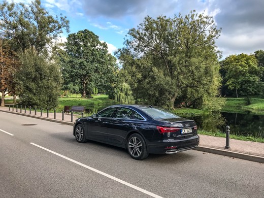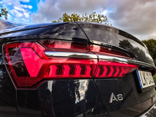Man A6 izskatās lielāks un platāks par priekšgājēju, it īpaši aizmugurējā daļa, aizmugurējās durvis. Tas tiešām ir limuzīns, kā rakstīts tehniskajā pasē. Bet vizuāli tas tomēr asociējas ar iepriekšējās paaudzes feisliftu, jo būtiski jauninājumi nav uzkrītoši. A6 izskatās uzlabots un palielināts, bet neredzu vai nesaprotu jauno Audi vizuālo identitāti. Audi A6 bagāžnieks ir ļoti dziļš un krietni ietilpīgāks, nekā lielākajai daļai apvidus automobiļu. Iesēžoties salonā, uzreiz var redzēt daudzos displejus, ir ļoti labi nostrādāts panelis, un man patika no koka veidotais izvirzījums. Tomēr jau iepriekšējos Audi modeļos man nepatika sadrumstalotais mērinstrumentu paneļa noformējums – ļoti raibi un piesātināts ar informāciju. Patīkams akcents ir navigācijas sistēmā integrētais satelīta attēls, kā arī skārienjutīgais ekrāns klimata kontrolei. Te var jautāt, vai tas ir vajadzīgs, bet strādāja labi. Atpakaļskata kamerai šajā klasē prasās augstāka izšķirtspēja, bet patika, kā ir sadalīti leņķi, parādītas līnijas un arī skats no augšas ir saprotams, tādējādi parkoties ir daudz vieglāk. Pārsēžoties no cita līdzīgas klases automobiļa, uzreiz acīs iekrita lētās plastmasas virzienrādītāju un logu tīrītāju sviras. Sajūta, ka tie šajā automobilī būtu no citas operas. Ir ļoti ērti un patīkami iesēsties aizmugurē, pateicoties lielai ailei un plašam durvju atvērumam.