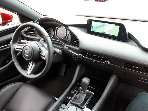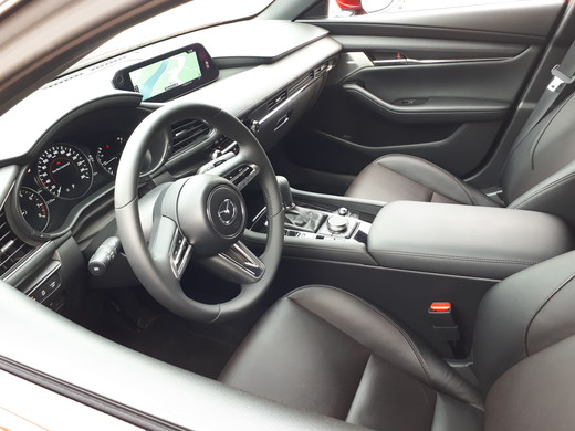 “Mazda3” izskatu ir vēlme baudīt, nedaudz atkāpjoties, kā atrodoties muzejā, bet iekāpjot iekšā, rodas sajūta, ka esmu nokļuvis speciāli man radītā vidē. „Mazda 3” vadītāja vieta drīzāk izskatās pēc sporta auto kokpita, nevis parasta golfa klases auto salona. Dažiem varbūt šķiet, ka aizrautībā radīt interesantu automobili „Mazda” ir aizgājusi par tālu, bet man atrasties salonā ir patīkami. Ikviena kokpita detaļa ir izvietota perfektā horizontālā simetrijā ar vadītāju centrā. “Mazda” inženieri atzīst, ka automašīnai jābūt ērtai, it kā vadītāja ķermeņa turpinājumam. Tāpēc, konstruējot šasiju un vadītāja darba vietu, īpaši daudz uzmanības tika veltīts cilvēka mugurkaula un iegurņa studijām – ar mērķi sasniegt ideālu ķermeņa stāvokļa līdzsvaru, braucot dažādos apstākļos. Lieliskie sēdekļi spēj noturēt iegurni vertikālā stāvoklī, kas ķermeņa augšdaļai ļauj kustēties dabiski un palīdz mazināt nogurumu. Taču, šis salons, kas it kā sakļaujas ap vadītāju, tādam brangam, centnerīgam latvietim parastajam varētu šķist par mazu. Arī aizmugurē sēdošajiem zemā jumta līnija un ierobežotā vieta kājām radīs sajūtu, ka atrodaties nevis ģimenes auto, bet esat iespiesti sporta kupejā. Taču, interjera kvalitātes ziņā Mazda jau konkurē ar kompaktās Premium klases pārstāvjiem. Tikai mūsu testētās mašīnas salonā pārāk jau nu dominē viena krāsa – melnā; melns ir viss – panelis, sēdekļu, jumts, durvis… šeit prasītos kāds priecīgāks, spilgtāks akcentiņš.