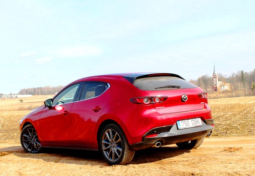 Testam saņēmu efektīgi sarkanu “Mazda3 2.0 M Hybrid Skyactiv-G Vision AT”. Reklāmas bukletā izlasīju, ka jaunā “Mazda 3” atšķirsies ar vadīšanas kvalitāti, līdzsvaru, drošības un dabiskuma izjūtu. Konstruēta, vadītāju novietojot centrā, ar mērķi vairot vadīšanas prieku, tā paātrinājuma, pagriezienu vai bremzēšanas laikā radīšot pilnībā dabisku sajūtu. Tieši vadīšanas dabiskumu akcentējuši Eiropas auto žurnālisti, kuriem jau ir bijusi iespēja izmēģināt “Mazda 3”. Uz viņiem labu iespaidu ir atstājusi “Mazda3” vadīšanas kvalitāte un spēja reaģēt uz vadītāja darbībām tieši tā, kā tiek gaidīts. Mani pirmajos brauciena kilometros visvairāk pārsteidz tieši klusums salonā! Tādu kā negaidītu Premium komforta sajūtu rada pārdomātā virsbūves izolācija – biezi stikli un speciāls vibrācijas absorbējošs pildījumus salona paneļos, kas nodrošina lielisku ārējo skaņu izolāciju. Klusumā ar tīru noti ieskanas augstākās kvalitātes “Bose” audio sistēma…
