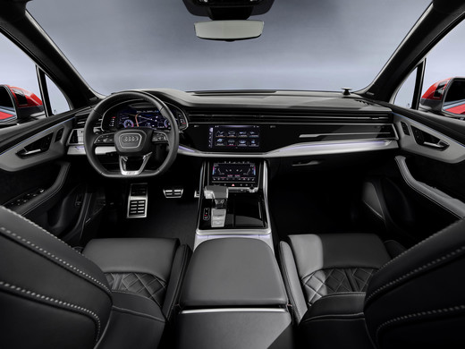 Kamēr nedarbojas dzinējs, priekšējais panelis izskatās tukšs un pamests kā sakaru centrs atompatvertnē, taču pēc starta komandas nekavējoties atdzīvojas īstā zemūdenes komandtiltiņa rosībā. Divu skārienjūtīgu ekrānu un virtuālā paneļa izvēlnēs var iestigt līdz ceļiem, taču ar laiku mazāk svarīgās vai vispār nesvarīgās funkcijas nogrimst kaut kur procesoru dzīlēs, bet atlikušās lietot nav nemaz tik grūti. Protams, man nebūtu nekas pretim regulēt temperatūru ar grozāmu kloķi, bet tad es tiktu uzskatīts par neglābjami vecmodīgu. Iespējams par tik vecmodīgu, ka joprojām gaužos par neērto pārnesumkārbas sviru, ko feislifts diemžēl atstājis neskartu. Pa šo laiku Audi Q7 salons kļuvis vēl greznāks, ja vien tas iespējams, un pat trešās rindas sēdekļi apgādāti ar izvērstu elektriskās regulēšanas sistēmu. Pat ja tur neviens nesēž un netaisās sēdēt, ir, ar ko padižoties draugiem. Kas zina, varbūt kāds no viņiem jau ir informēts, ka septiņvietīgiem Q7 pneimopiekare tagad ir standartā.