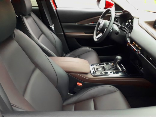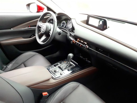"Mazda CX-30" salonā viss šķiet tieši tāpat kā "Mazda 3" hečbekā. "Mazda" uzskata, ka automašīnai jābūt ērtai kā vadītāja ķermeņa turpinājumam. Ikviena kokpita detaļa ir izvietota perfektā horizontālā simetrijā ar vadītāju centrā. Lieliskie sēdekļi spēj noturēt vadītāja iegurni vertikāli, kas ķermeņa augšdaļai ļauj ieņemt dabisku pozu un palīdz mazināt nogurumu. Un patiešām - kad esmu ērti iekārtojies vadītāja vietā pie stūres, jūtos ideāli! Priekšā sēdošajiem ir nodrošināts pilns komforts, taču aizmugurējiem pasažieriem ceļgalu rajonā vietas nav daudz, vēlams, lai aizmugurē sēdošie nebūtu apveltīti ar īpaši garām kājām.
