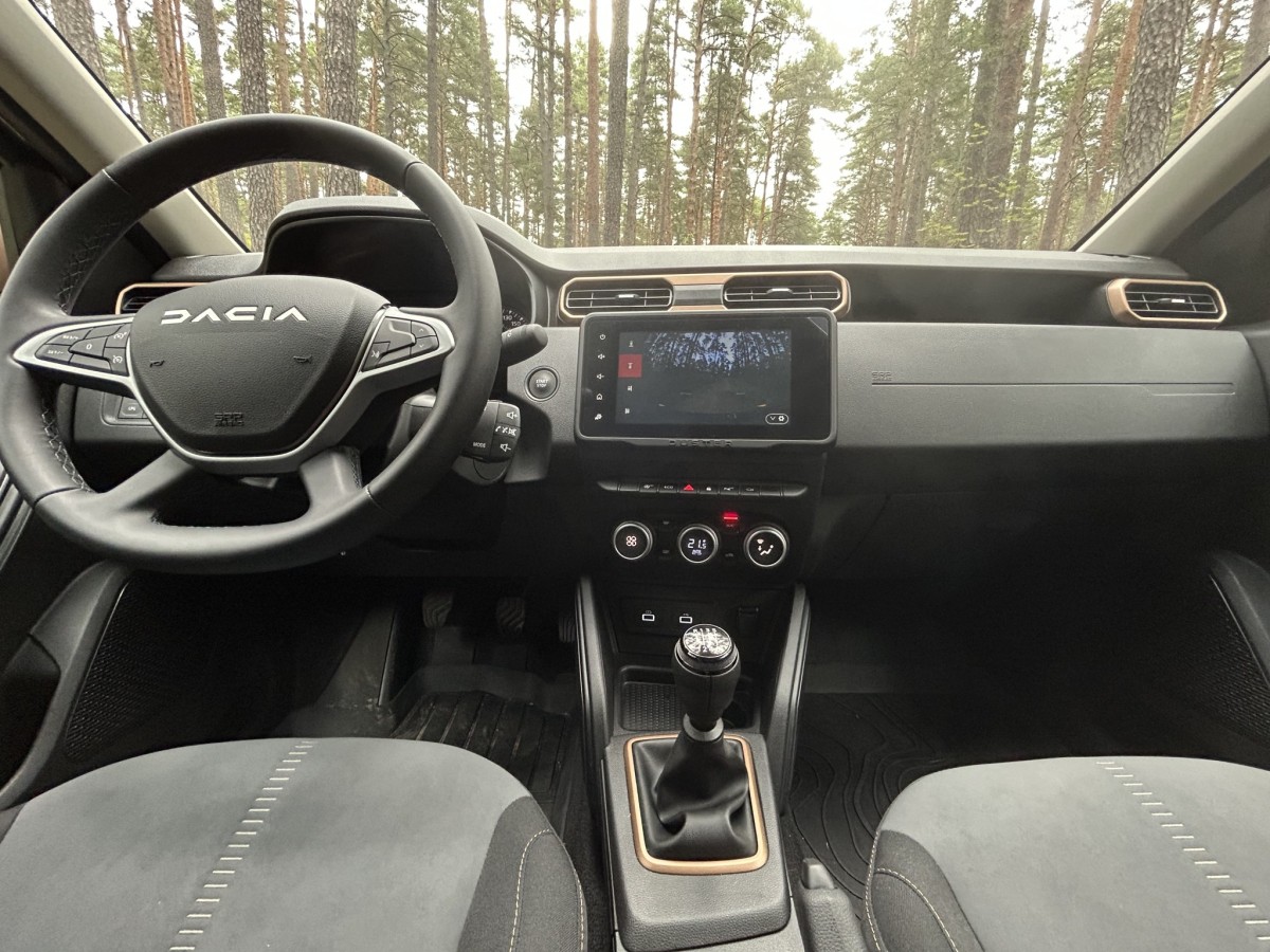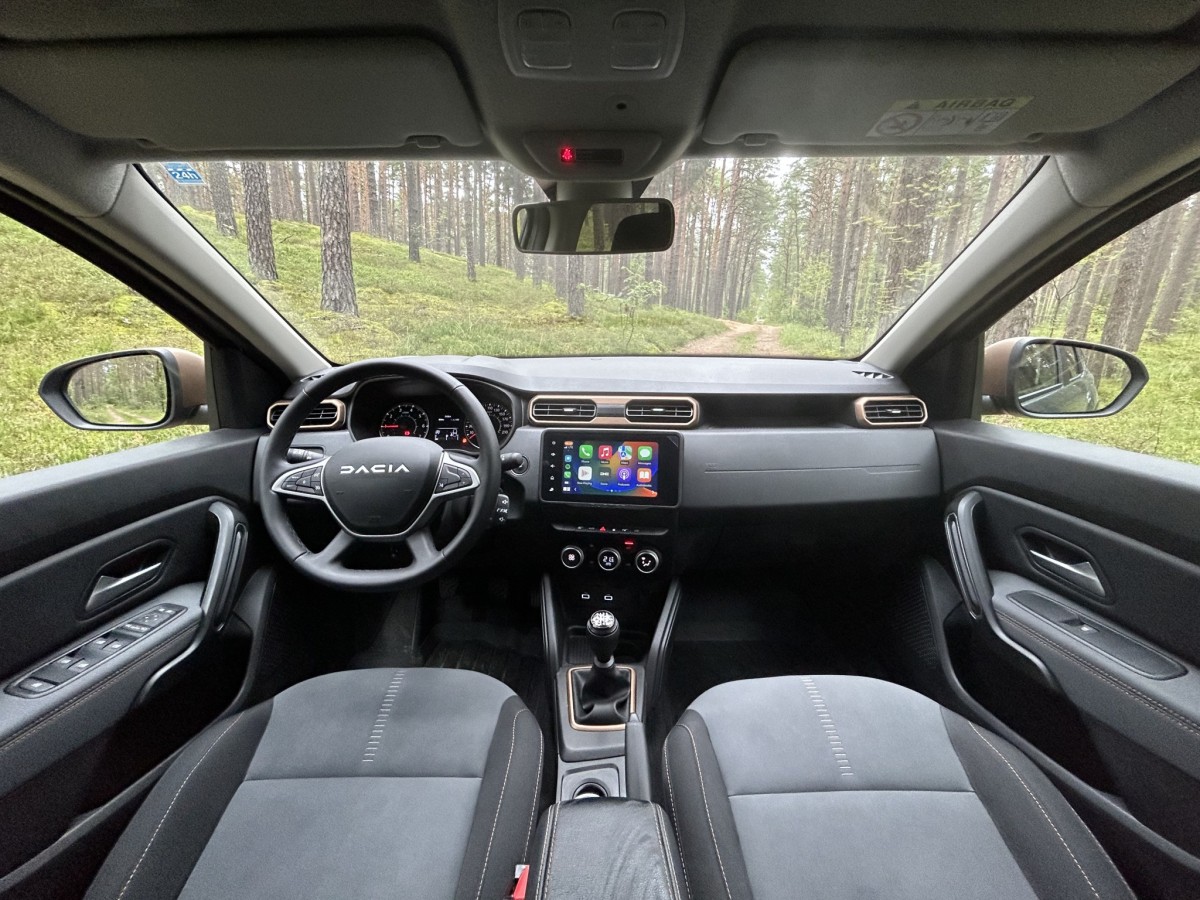 Duster Extreme Komplektācijā ietilpst svarīgākās braukšanas un drošības atbalsta sistēmas, LED dienas gaitas, tuvās un aizmugurējās gaismas, MultiView kameru sistēma ar četrām kamerām priekšā, aizmugurē un sānos, klimata kontrole, multimediju sistēma ar košu skārienekrānu un, kas mūsdienās nav mazsvarīgi, – iespēju lietot Apple CarPlay un Android Auto bezvadu režīmā. Izmēģinātā Duster apdarē savukārt izmantots audums, kura īpašības lieliski korelē ar modeļa papildnosaukumu Extreme. Proti, ja kādreiz gadās mašīnā nejauši ierausties ar dubļainām biksēm, bēda ir maza, jo šāda veida un pat šokolādes traipus var ātri izberzt ar mitrajām salvetēm vai vienkārši slapju drānu.